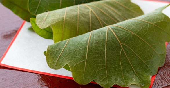 The reverse side features dyed kashiwa leaves, traditionally used in Japan to celebrate a child’s growth.
