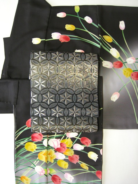 訪問着 日本の四季の花 詩季衣 チューリップ 黒 .
