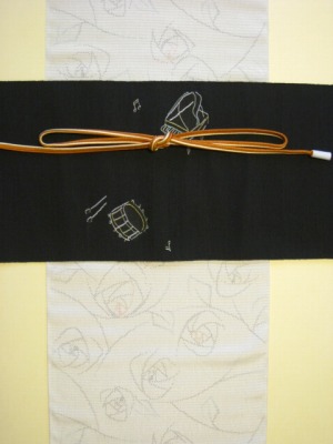 は、バラの白地の小紋に楽器の名古屋帯ですね。