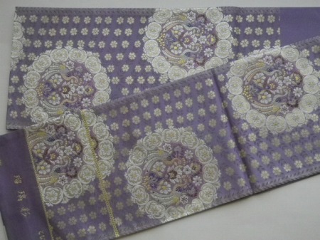 花や鳥の柄が楽しく華やかです。藤色の色合いが上品で好感度が高いです。