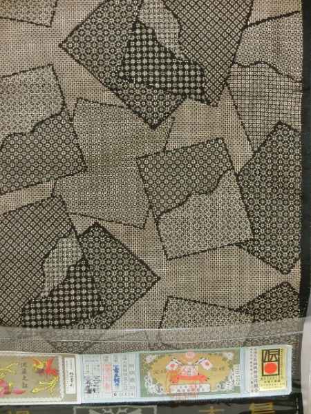 本場大島紬手織り割り込み泥染めカルタと染め牛首紬袋帯更紗鳥や花